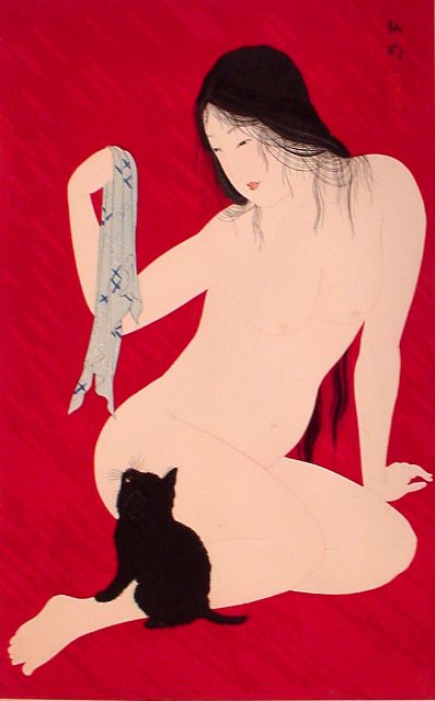 O-65. Nude playing with cat